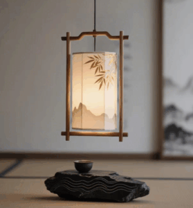 Khung gỗ mộc cương trực ôm lấy chao trụ vải/giấy in họa tiết trúc – sơn thủy. Form đèn tinh giản, hợp không gian Thiền, Á Đông tối giản.