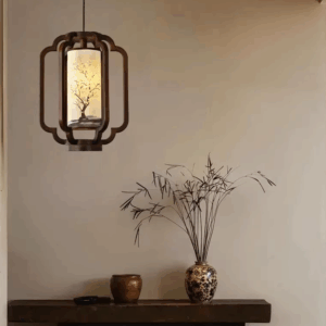 Đèn thả gỗ Mộc Diệp được chế tác từ chất liệu gỗ tự nhiên cao cấp, kết hợp khung gỗ uốn cong mềm mại ôm trọn phần chao đèn. Chính sự kết hợp này tạo nên tổng thể hài hòa, ấm áp nhưng không kém phần độc đáo. Trên lớp chao vải, họa tiết cành lá, núi non, trúc và thiên nhiên được in thủ công, gợi nhớ đến bức tranh thủy mặc truyền thống. Khi ánh sáng dịu nhẹ lan tỏa, toàn bộ chi tiết trở nên sống động, mang đến cảm giác như đang lạc bước vào một không gian thiền tĩnh, thư thái.