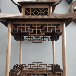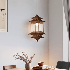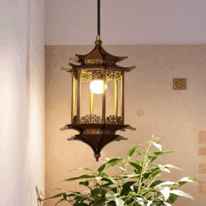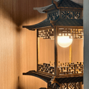Đèn gỗ Song Đỉnh Huy lấy ý tưởng từ kiến trúc mái chùa – lầu các truyền thống, biểu tượng của sự thanh cao, trường tồn và thịnh vượng. Thiết kế gồm hai tầng mái cong uyển chuyển, tựa như hình ảnh “song đỉnh” – hai đỉnh mái song song vươn cao, tượng trưng cho sự cân bằng và hài hòa trong phong thủy.
